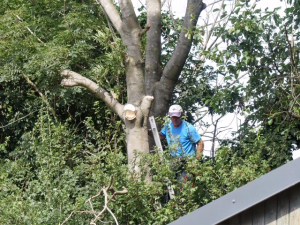 De bomen langs onze banen leiden regelmatig tot veel vervuiling van onze banen. Bladeren, maar ook allelei andere stukjes tak en dergelijke. Verzoeken aan de gemeente om daar iets aan te doen, hebben nog niet tot een reactie geleid. Daarom heeft onze onderhoudsploeg zelf met gebruik van een lange ladder en een verlengde zaag zoveel mogelijk overhangende takken weggehaald. Dat zal ongetwijfeld leiden tot afname van baanvervuiling en dus tot minder werk voor onze onderhoudsmensen.