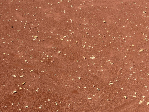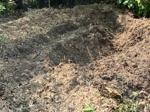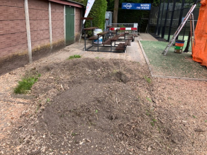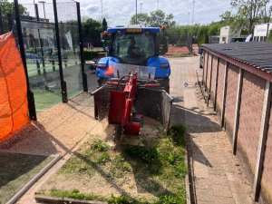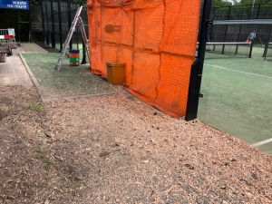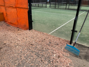 De kids onder leiding van Rowena op baan 5 trainden echter stoer door alsof er niks aan de hand was. Later zijn de stukjes hout door Joop met de blower van de baan verwijderd. Op padelbaan C lukte het wat beter om overvliegende stukjes hout van de baan te houden, maar ook daar moest na afloop stevig met de hark en bezem worden aangepakt om de baan weer schoon te krijgen. De hopen aarde en hout bij de plekken waar is gefreesd, zijn intussen verwijderd.