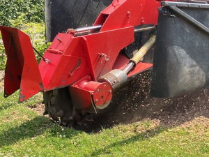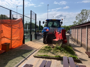 Op 4 juni kwam er een grote trekker het park opgereden om de vijf boomstronken die over waren gebleven na het rooien van de bomen, te verwijderen door die diep uit de grond te frezen. Dat is nodig om daarna de werkzaamheden te kunnen uitvoeren die gepaard gaan met de aanleg van de nieuwe padelbanen. Dat ging gepaard met in het rond vliegen van duizenden stukjes hout. Al onze pogingen om met het aanbrengen van zeildoeken te voorkomen dat er stukjes hout terecht zouden komen op de tennis- en padelbanen naast het werk, hadden - mede door de stevige wind die er stond - slechts gedeeltelijk effect. Later bleek zlfs dat er nog meer wortels moesten worden weggewerkt; dus kwam de machine nog een keer terug.