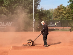 De leverancier van het apparaat is vervolgens gevraagd op zoek te gaan naar een aangepaste machine die het gravel sneller, maar vooral dieper uit de mat kan halen. We hopen dat nieuwe apparaat snel te kunnen uitproberen. In de tussentijd is op baan 5 op enkele momenten waarop we de eerder uitgeprobeerde borstelunit konden lenen, doorgegaan met het bestrijden van de verharding en gladheid. Aanvullend is gebruik gemaakt van een eigen oude handborstelmachine met een harde bezem die op de club aanwezig is (foto 2 en 3). Dat leidt op zich tot een goed resultaat (foto 4), maar is ook zeer arbeidsintensief. Het kost namelijk vele uren om op die wijze een baan, en al helemaal alle banen, aan te pakken. Omdat onzeker is hoeveel droog weer er de komende najaarsperiode nog is en daarmee hoeveel werkbare onderhoudsuren aan de baan, is de kans aannemelijk dat het nog een aantal maanden duurt, voordat de problemen (op alle banen) zullen zijn opgelost.