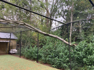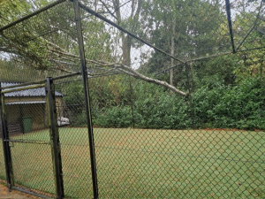 Een aantal maanden geleden viel er al een boom op een van de oefenkooien, die daardoor flink beschadigd raakte. De gemeente kwam na een belletje snel om de boom te verzagen en op te ruimen en korte tijd later kwamen er zowaar werklui om in een deel van het bos achter de banen 1 en 2 een aantal bomen om te zagen. Die klus werd echter - in onze ogen - halverwege gestaakt. Desgevraagd verklaarden de werklui dat het verdere onderhoud volgens plan ergens in 2026 zou plaatsvinden. Bij contacten met de wethouder is van onze kant daarna - onder verwijzing naar de risico's en de schade - enkele keren nadrukkelijk gevraagd dat eerder te doen. Dat leidde niet direct to actie.
