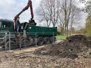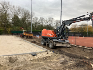 Maandag 1 december is de grond waar de nieuwe toegangsweg moet komen, weggegraven. Daarbij zijn nog de nodige dikke wortels die doorliepen tot onder baan 5 weggehaald. Daarna is Repac aangebracht als ondergrond voor de later op een laag zand aan te brengen dikke straategels. Intussen is ook de afgegraven aarde afgevoerd.