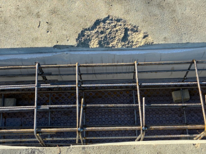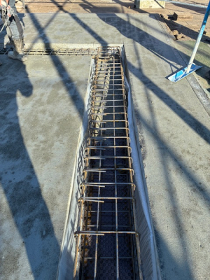 “Ze” zijn nu echt weer op stoom. Vandaag wordt de wapening aangebracht. Hiertoe worden de sleuven eerst netjes voorzien van folie aan de zijkanten en nog een laag “hecht” folie op de bodem.