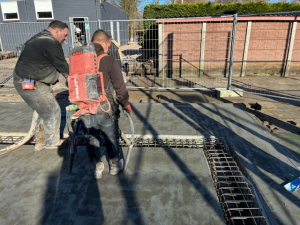Nu met het weghalen van de uitgezaagde stroken waarin het gewapende funderingsbeton moet worden gestort t.b.v. de bevestiging van staanders van de padelbanen. Op twee foto’s zijn lichte beschadigingen van de vloer te zien. Geen nood. Hebben de bouwers zelf ook gezien. Wordt uiteraard gerepareerd. De betonstorter zal worden opgeroepen om de fundering te gaan storten. Wordt vervolgd.